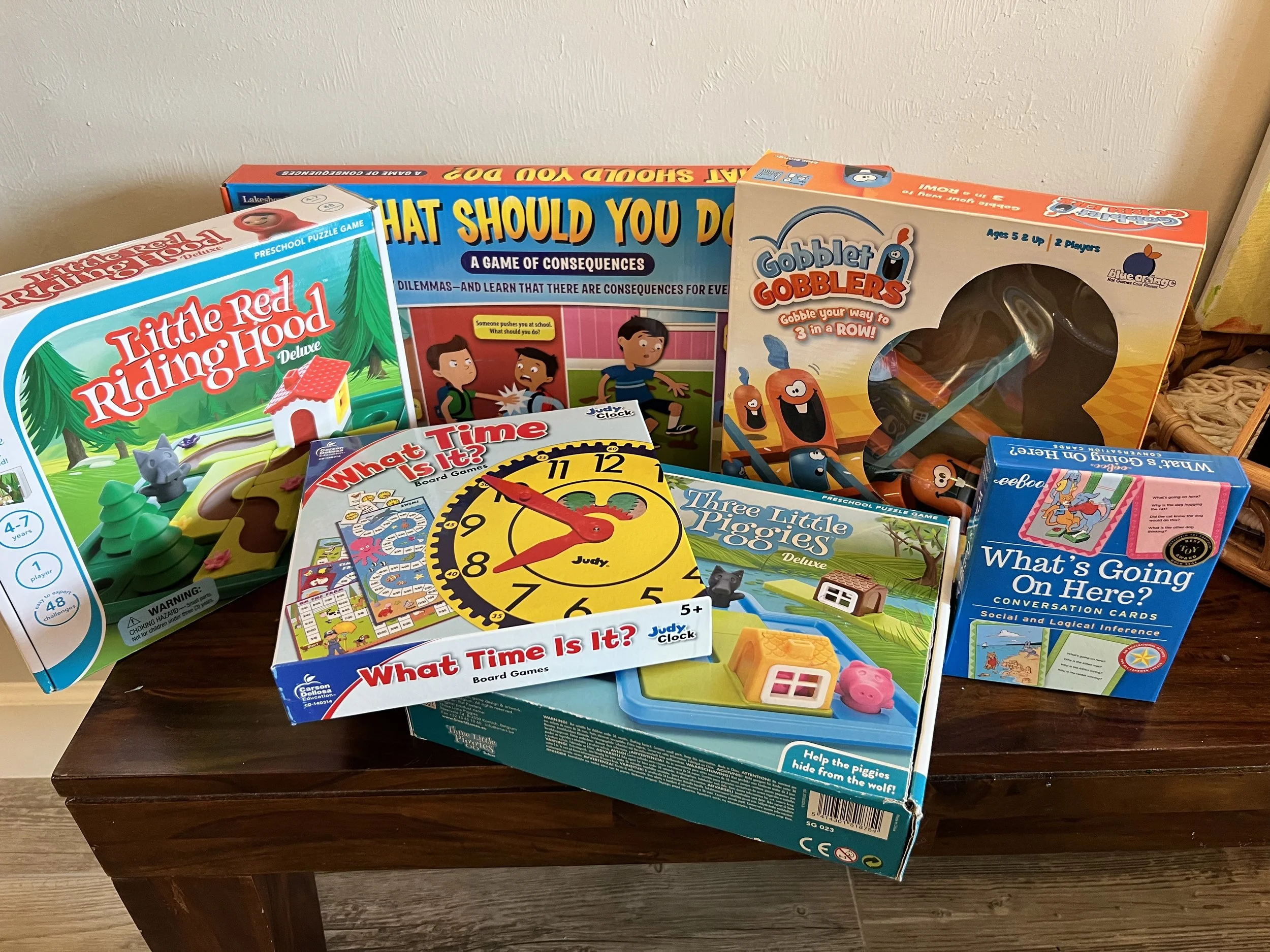 In our home specifically, we needed extra help this area. We use Bananagrams often for fun, silly, learning play. We also enjoyed games that illustrate cause and effect like What Should You Do? Another option that we liked was What’s Going On Here? These are more like conversation cards that we worked into our bedtime routine. They’re provide a low stress way to talk about what may be appropriate and inappropriate ways to respond in a variety of situations.